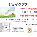 2025年5月6日 / 最終更新日 : 2025年10月30日 shoko お知らせ ジョイクラブ 2025年6月 ジョイクラブのお知らせ 小学4年~6年生の集まりです。 2025年6月6日(金) 午後5時~6時45分 ※夕ごはん代200円