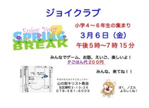 2026年2月24日 / 最終更新日 : 2026年2月24日 shoko お知らせ ジャンプクラブ 2026年3月 ジャンプクラブのお知らせ 学生の楽しい集まりです。 2026年3月27日(金) 午後7時~9時 夕ご飯代 300円